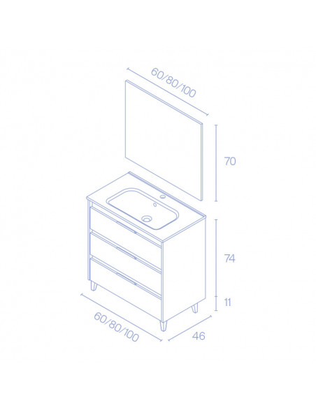 SUKI está DISPONIBLE EN VARIAS MEDIDAS 60, 80, 100 y 120 cms. En este caso, el mueble de baño SUKI es un conjunto completo compuesto por 2 elementos: 1 mueble con tres cajones y lavabo cerámico, que combina sobriedad y elegancia.