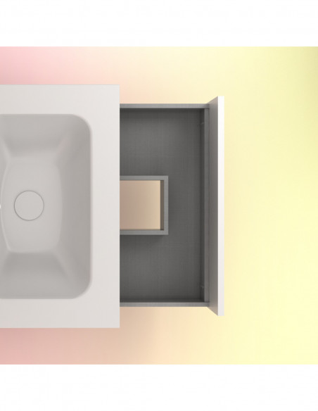 CARACTERÍSTICAS TÉCNICAS: Realizado en tablero de 16mm lacado blanco alto brillo, el interior de los cajones del mueble NIWA está realizado en una textura gris textil y las guias incorporan cierre amortiguado y otorgan accesibilidad total al interior del cajón.