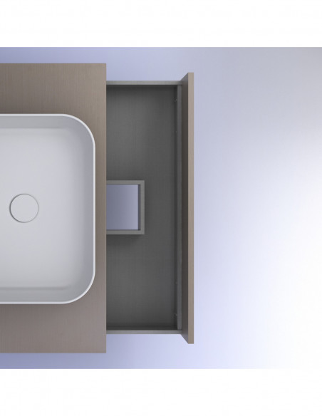CARACTERÍSTICAS TÉCNICAS: Realizado en tablero de 16mm melamina Fumé Arenado, el interior de los cajones del mueble NIWA TOP está realizado en una textura gris textil y las guias incorporan cierre amortiguado y otorgan accesibilidad total al interior del cajón.