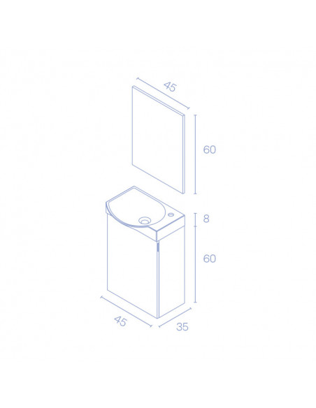 Completan el conjunto un lavabo cerámico y un espejo rectangular que cuenta con cantos grises y trasera con una altura de 60 cms.