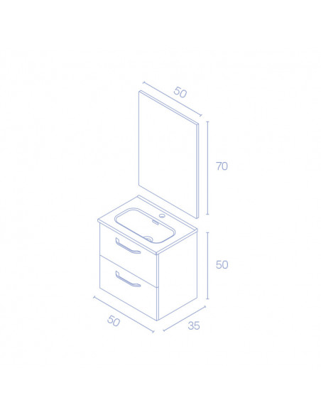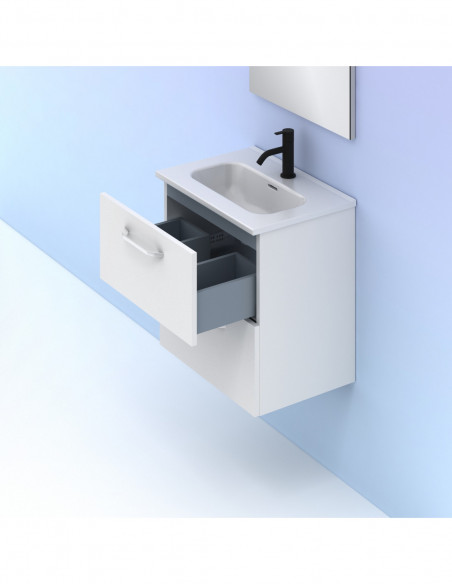 Completan el conjunto un lavabo cerámico blanco brillo y un espejo rectangular que cuenta con cantos grises y trasera con una altura de 70 cms.