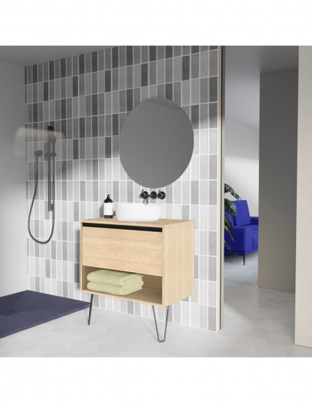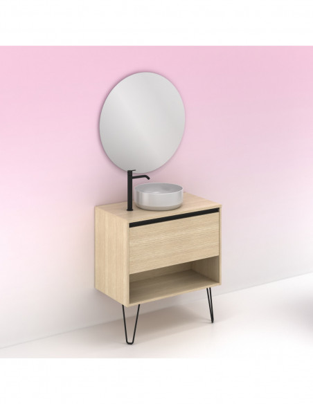 Mueble de baño YOKO de 80 cms con 1 cajón y 1 hueco. Acabado Roble Arenado | Incluye lavabo cerámico y espejo.